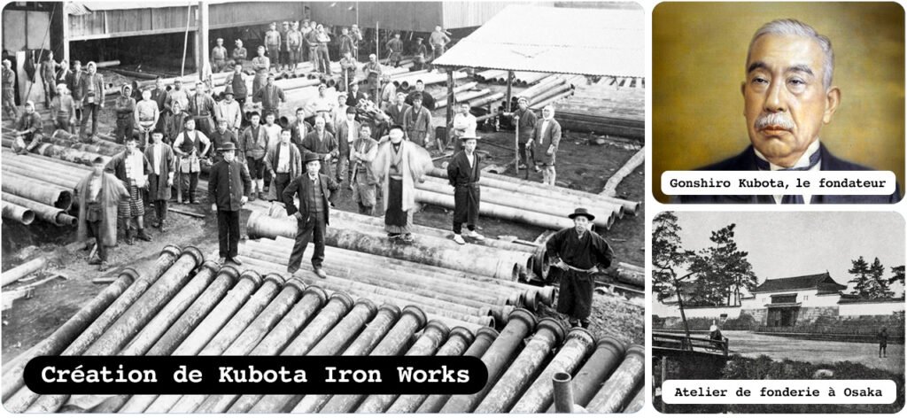 Gonshiro Kubota naît en 1870 à Osaka, au Japon, dans une famille modeste. Très tôt, il se passionne pour le travail du métal, la fonderie et la modernisation industrielle du pays. À seulement 20 ans, en 1890, il fonde un atelier de fonderie : Kubota Iron Works. L’entreprise fabrique alors des tuyaux en fonte destinés à l’approvisionnement en eau potable — un enjeu majeur de santé publique dans un Japon en pleine modernisation.